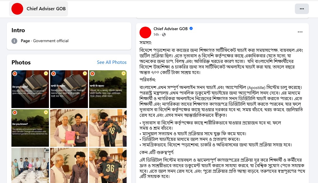 পোস্টে বলা হয়েছে, পূর্বে বিদেশে পড়াশোনা বা চাকরির জন্য শিক্ষাগত সনদ যাচাই করা সময়সাপেক্ষ, ব্যয়বহুল ও জটিল ছিল। দূতাবাস বা বিদেশি কর্তৃপক্ষের কাছে বারবার যাওয়া প্রয়োজন হতো, যা শিক্ষার্থী ও প্রবাসীদের জন্য চাপ, বিলম্ব এবং অতিরিক্ত খরচের কারণ হয়ে দাঁড়াত। নতুন অনলাইন সিস্টেম চালু হলে বছরে অন্তত ৭০০ কোটি টাকা সাশ্রয় হবে।